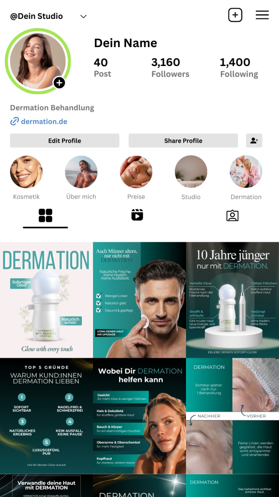 Alle Inhalte, Vorlagen und Anleitungen, die du brauchst, um Dermation erfolgreich auf Social Media zu vermarkten.
